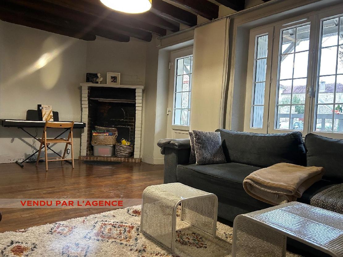 Séjour avec cheminée, cuisine, salle à manger, toilettes.
