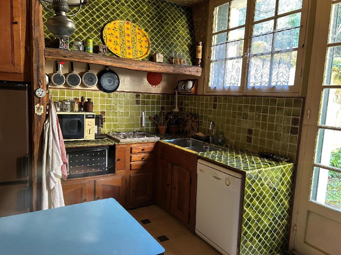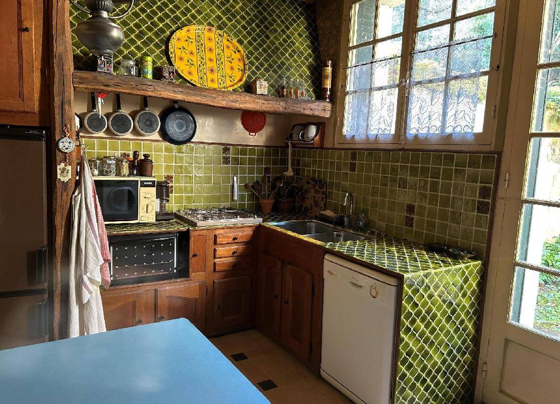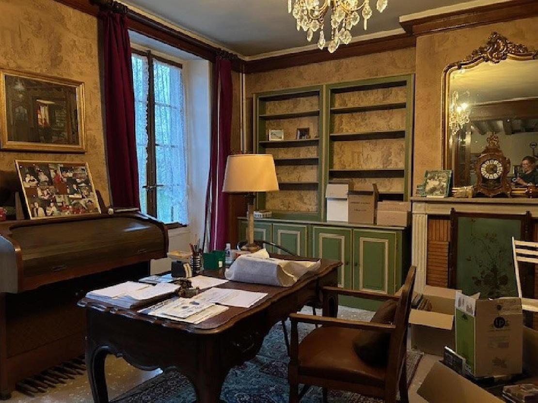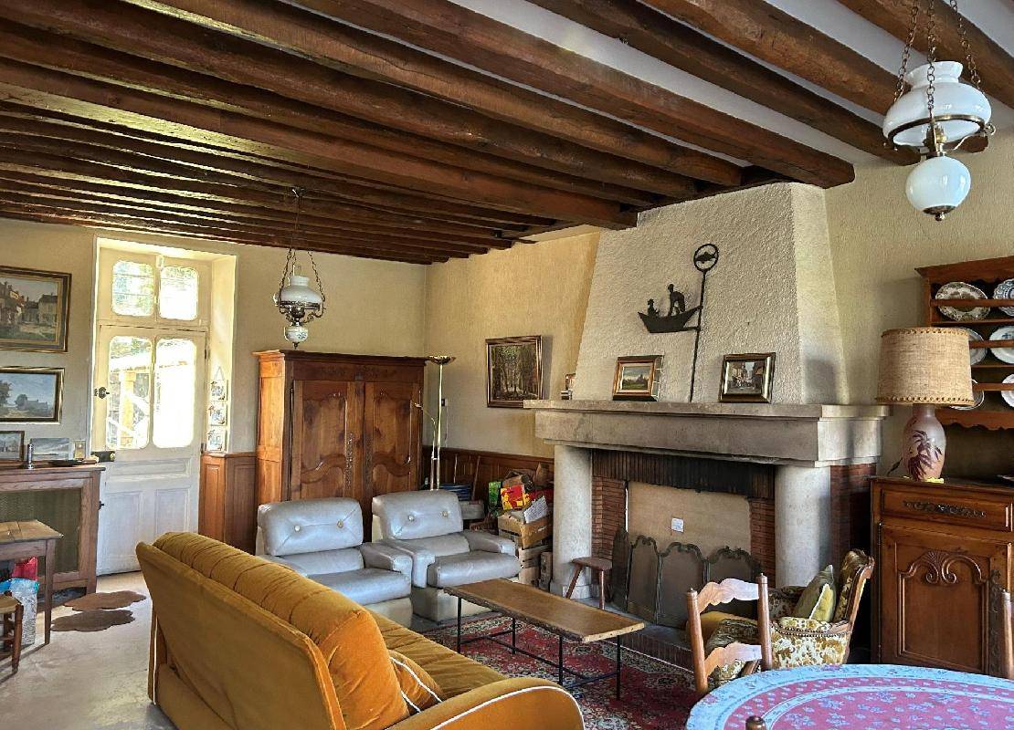 Entrée, belle pièce de vie traversante avec cheminée donnant sur jardin, salle à manger, cuisine.